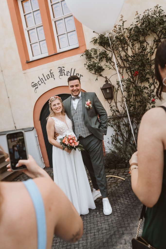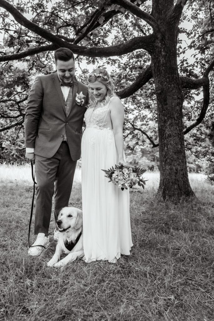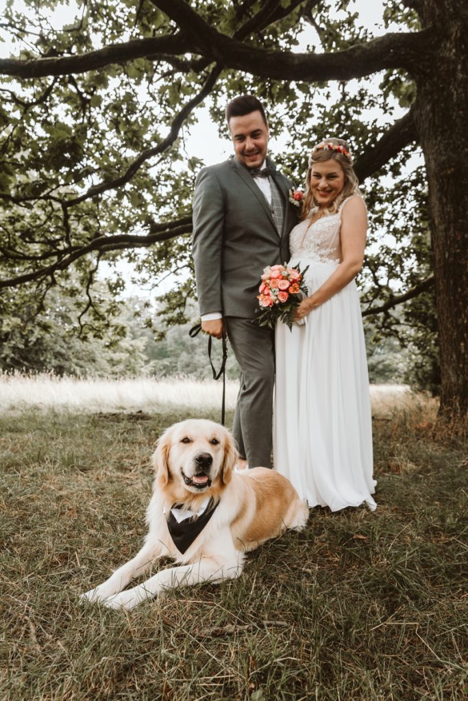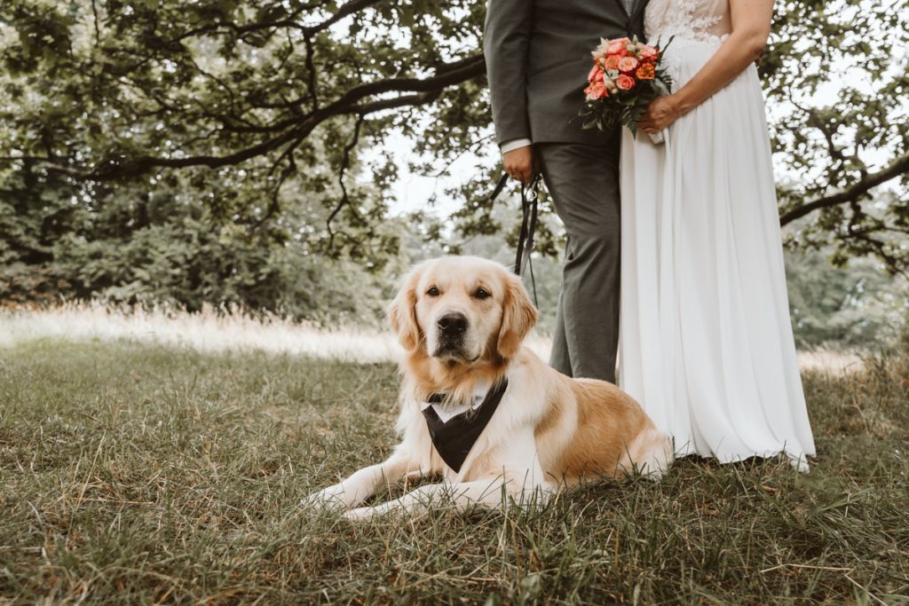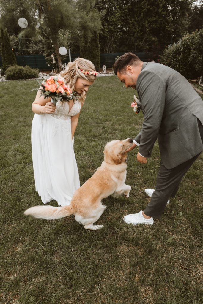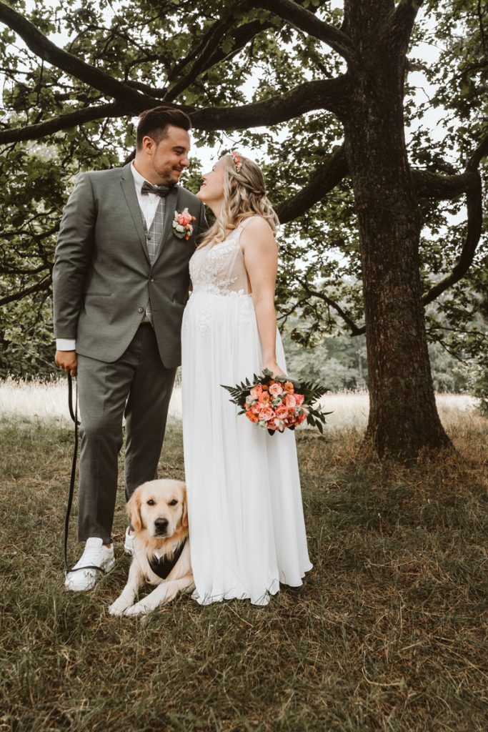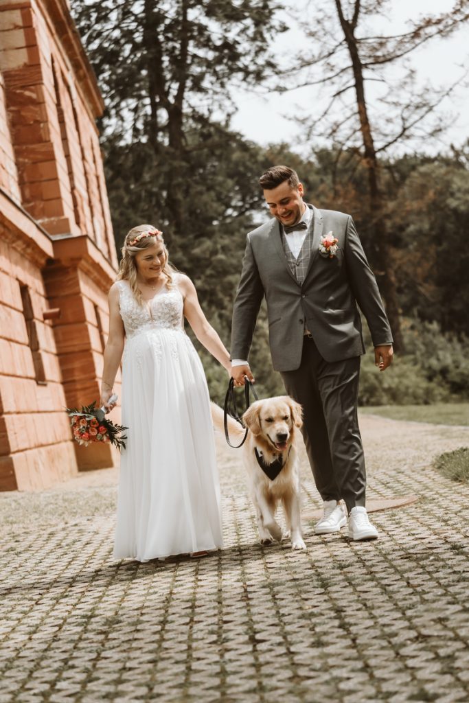 Zunächst gab es einen schönen „First Look“ im Garten der Eltern. Bruno durfte hier natürlich nicht fehlen und hat bereits ordentlich Aktion reingebracht. Die Trauung fand im Standesamt im Wehener Schloss statt, bevor es anschließend zum Paarshooting (natürlich inklusive Bruno) zum Jagdschloss Platte weiterging. Hier konnten wir schöne Erinnerungen im hohen Gras und unter großen Bäumen festhalten.