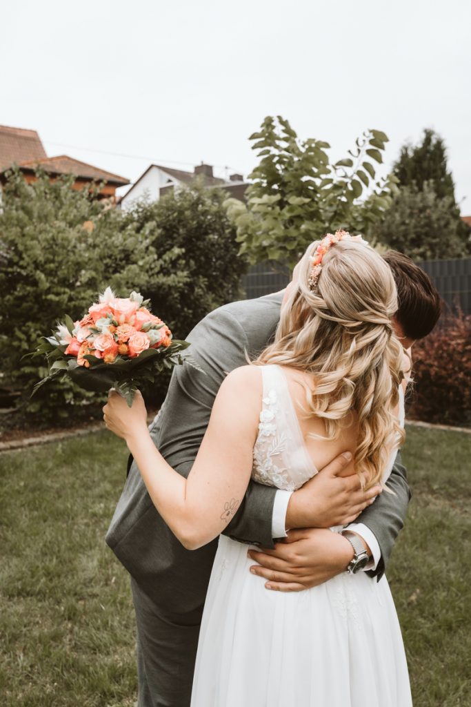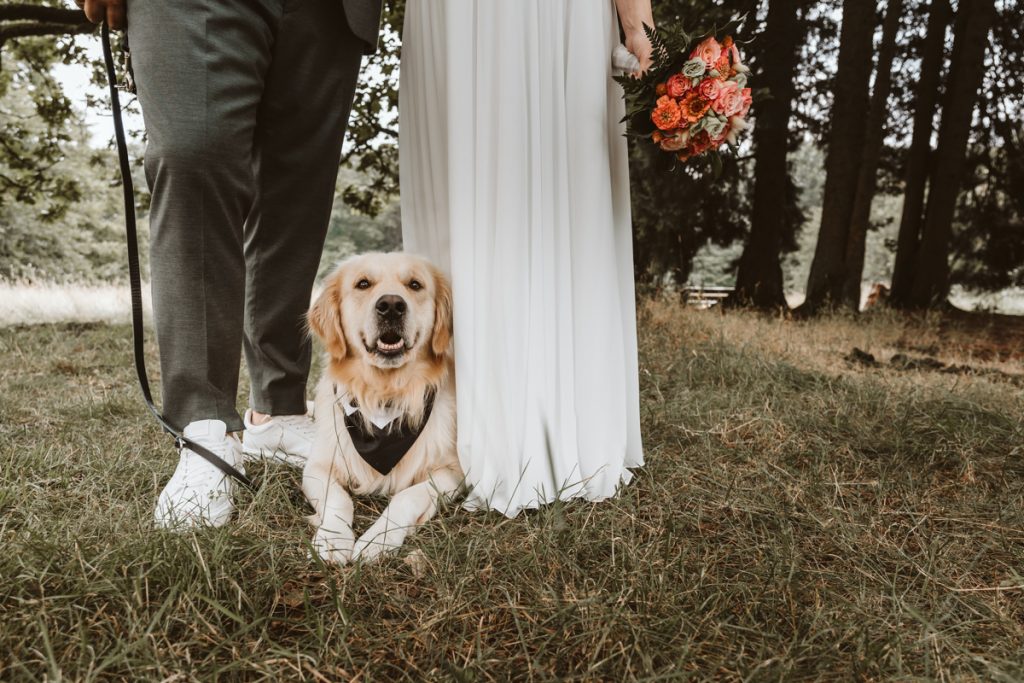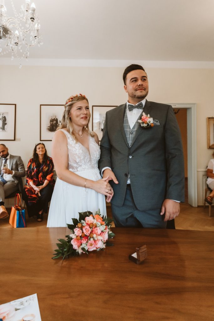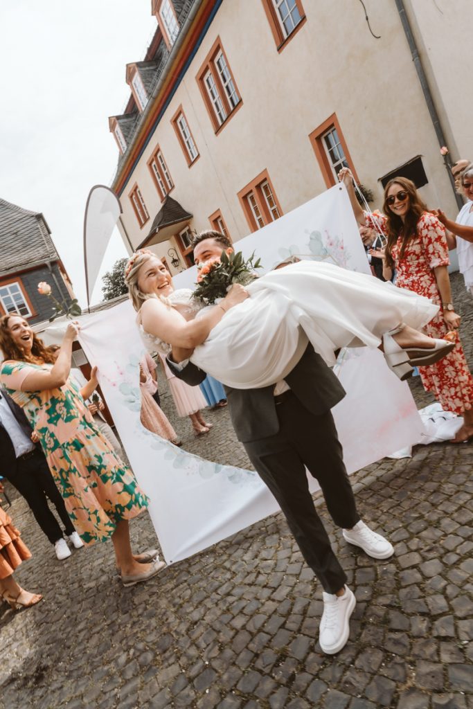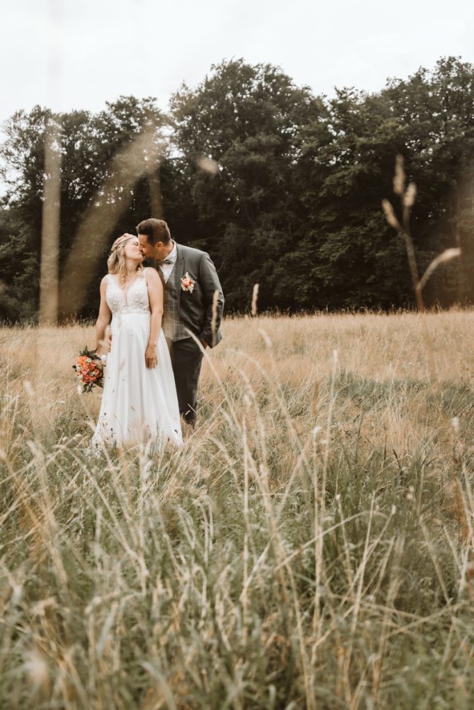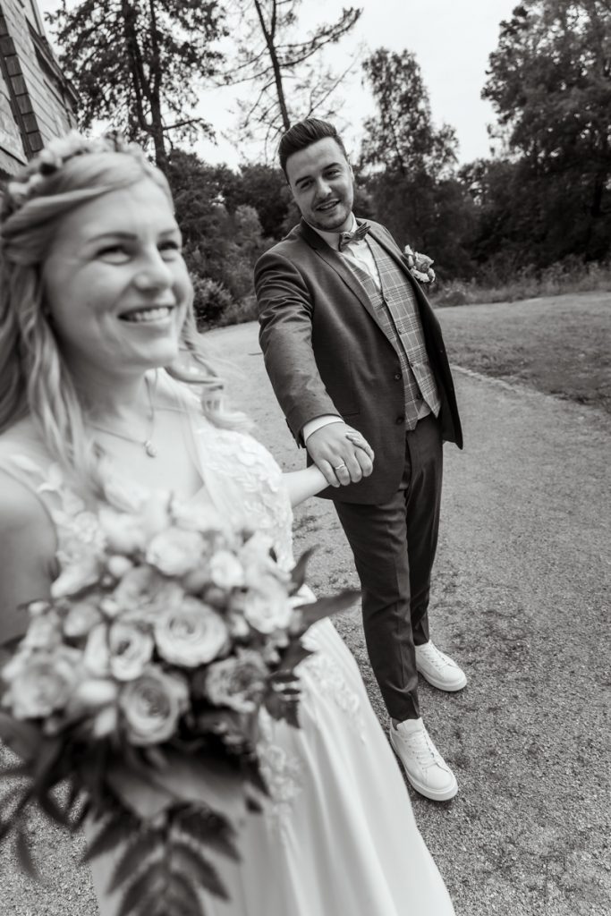 Zunächst gab es einen schönen „First Look“ im Garten der Eltern. Bruno durfte hier natürlich nicht fehlen und hat bereits ordentlich Aktion reingebracht. Die Trauung fand im Standesamt im Wehener Schloss statt, bevor es anschließend zum Paarshooting (natürlich inklusive Bruno) zum Jagdschloss Platte weiterging. Hier konnten wir schöne Erinnerungen im hohen Gras und unter großen Bäumen festhalten.