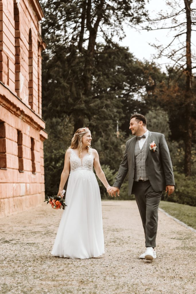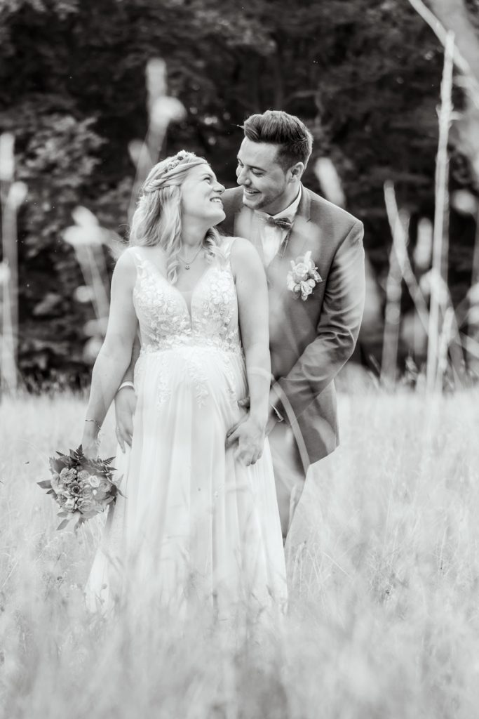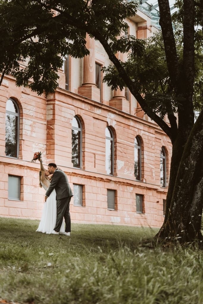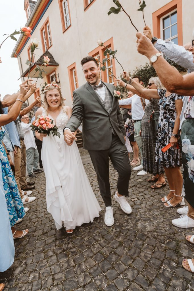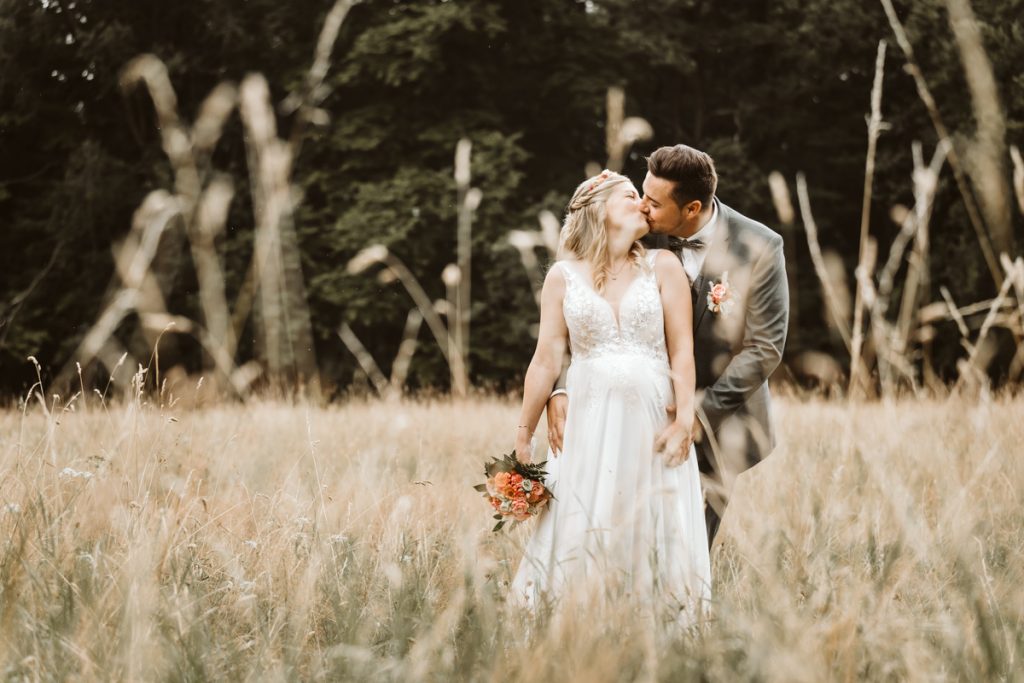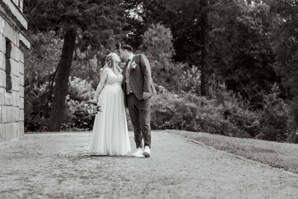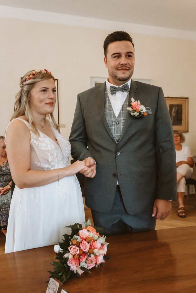 Zunächst gab es einen schönen „First Look“ im Garten der Eltern. Bruno durfte hier natürlich nicht fehlen und hat bereits ordentlich Aktion reingebracht. Die Trauung fand im Standesamt im Wehener Schloss statt, bevor es anschließend zum Paarshooting (natürlich inklusive Bruno) zum Jagdschloss Platte weiterging. Hier konnten wir schöne Erinnerungen im hohen Gras und unter großen Bäumen festhalten.