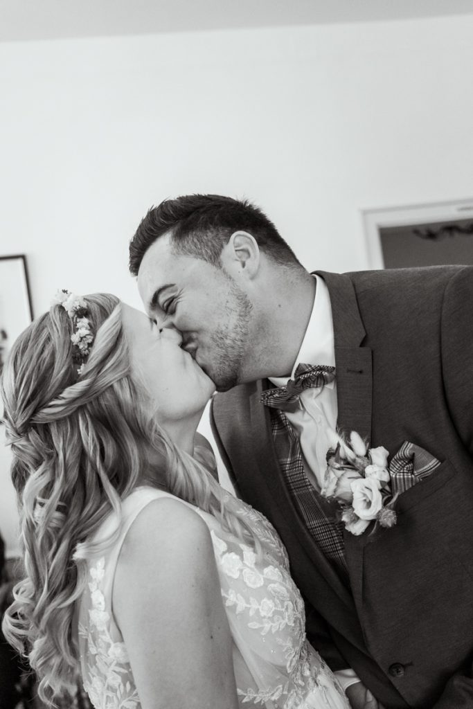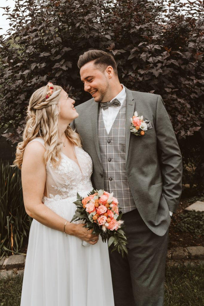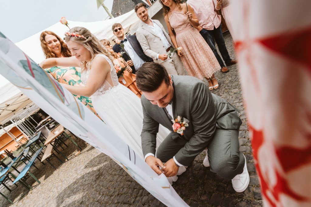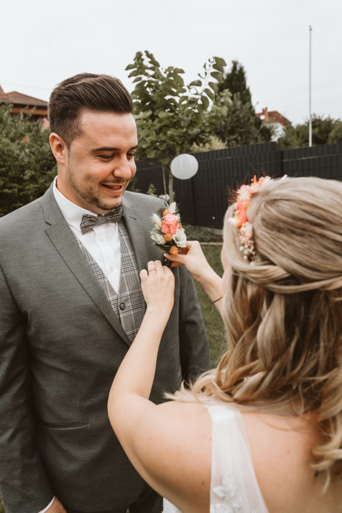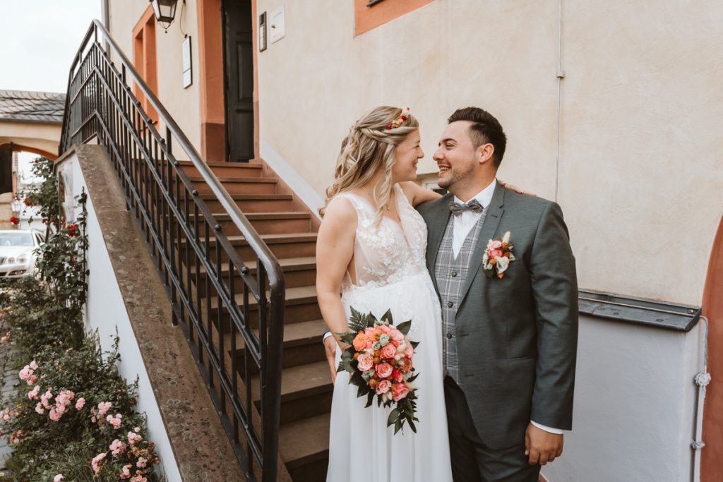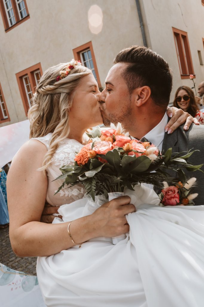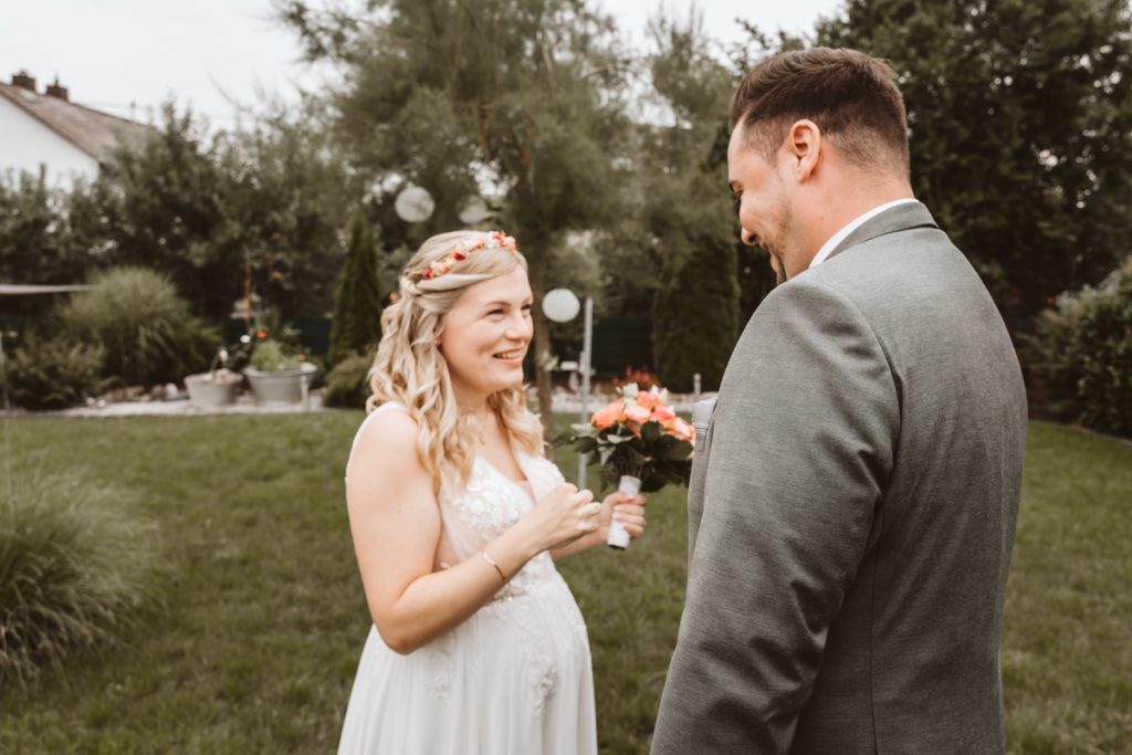 Zunächst gab es einen schönen „First Look“ im Garten der Eltern. Bruno durfte hier natürlich nicht fehlen und hat bereits ordentlich Aktion reingebracht. Die Trauung fand im Standesamt im Wehener Schloss statt, bevor es anschließend zum Paarshooting (natürlich inklusive Bruno) zum Jagdschloss Platte weiterging. Hier konnten wir schöne Erinnerungen im hohen Gras und unter großen Bäumen festhalten.