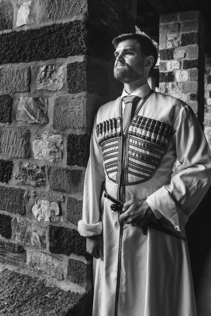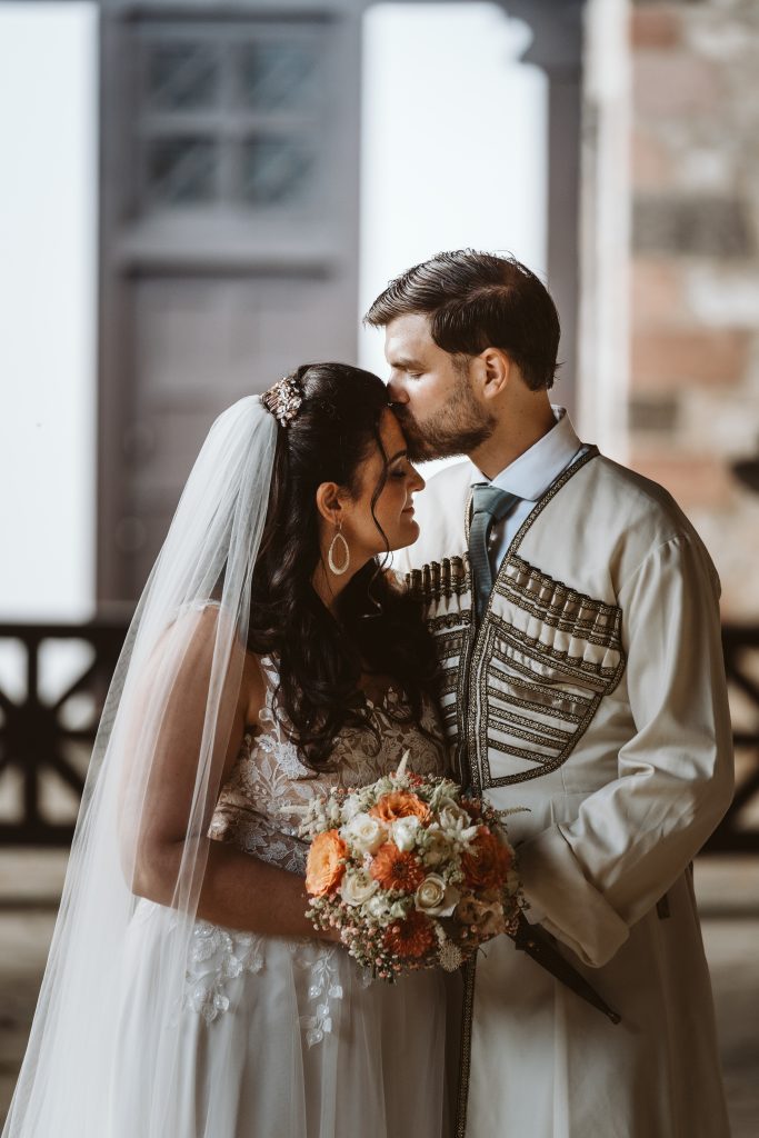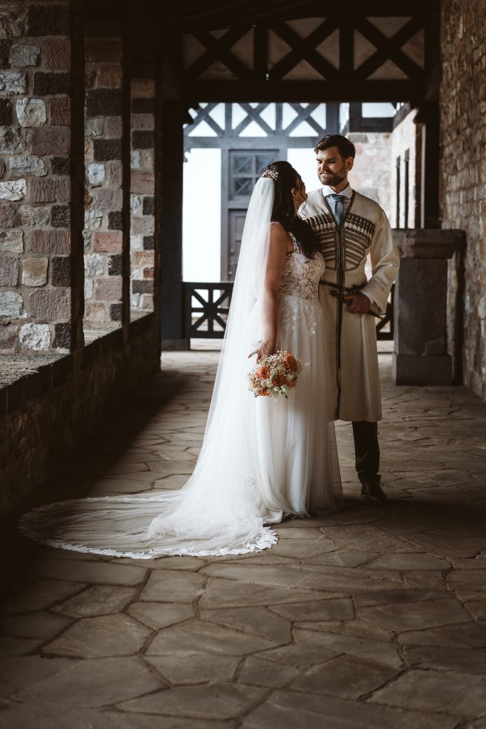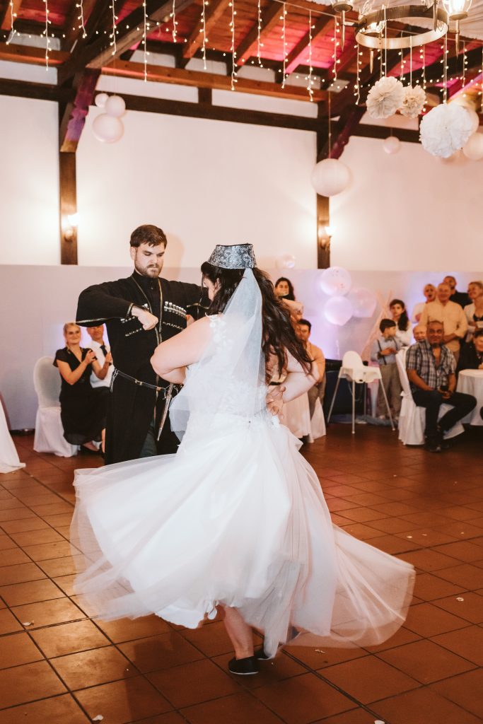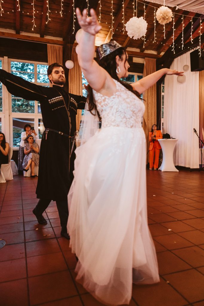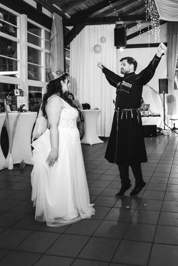 Eine wahrlich besondere Hochzeit, die ich mit Maya und Marcus erleben durfte. Maya ist gebürtige Georgierin und daher durften viele georgische Einflüsse während des Tages natürlich nicht fehlen. Marcus trug zum Beispiel während des Shootings eine sogenannte „Tschocha“ (traditioneller Mantel bzw. Tracht für Männer). Auch der Hochzeitstanz der beiden bleibt mir in Erinnerung. Laut Erzählungen der beiden war langes Üben erforderlich, damit sie den traditionellen Hochzeitstanz wirklich super toll hinbekommen haben. Natürlich durfte bei dem Tanz, die typische Tracht dabei nicht fehlen.